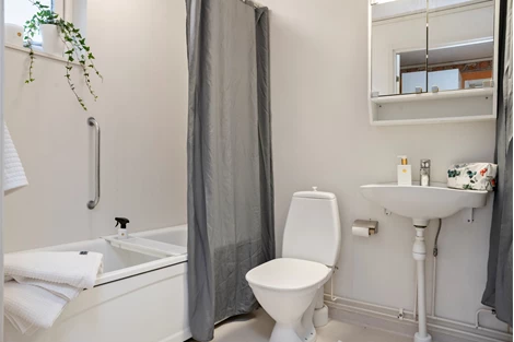 Badrummet erbjuder badkar för avkopplande stunder, och bostaden kompletteras av mycket goda förvaringslösningar samt ett generöst tilltaget förråd.
