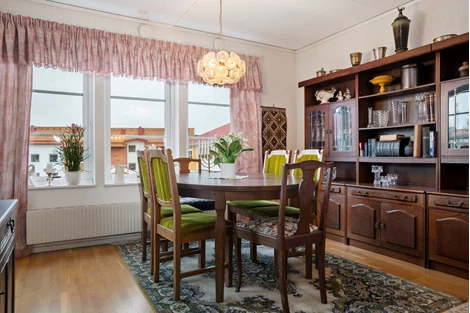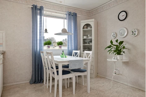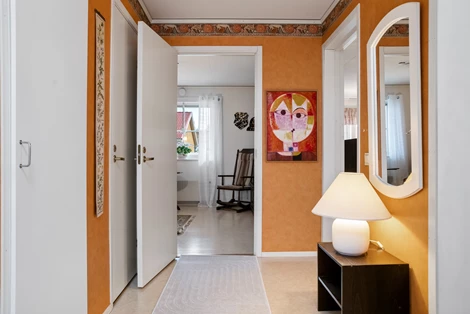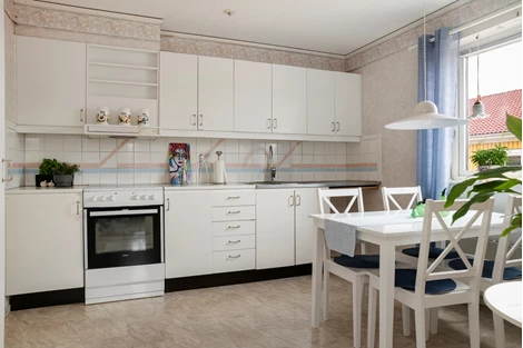 Köket är välplanerat med goda arbetsytor, rikligt med förvaring och en ljus, inbjudande matplats där både vardagsmiddagar och festliga tillfällen får ta plats. De två sovrummen är rymliga och harmoniska, med flexibla användningsmöjligheter för såväl familjeliv som arbete hemifrån.